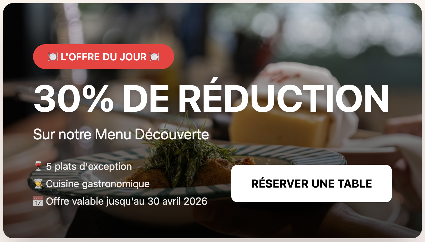 Une formule secrète à midi, un dessert à prix doux, un apéro surprise ce soir, les bons plans gourmands que vous ne verrez pas ailleurs.